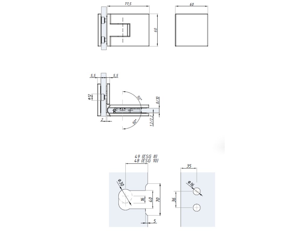 Pant s bočním kotvením a s aretací ± 90° (sklo - sklo 90°)-kartáčovaný chrom